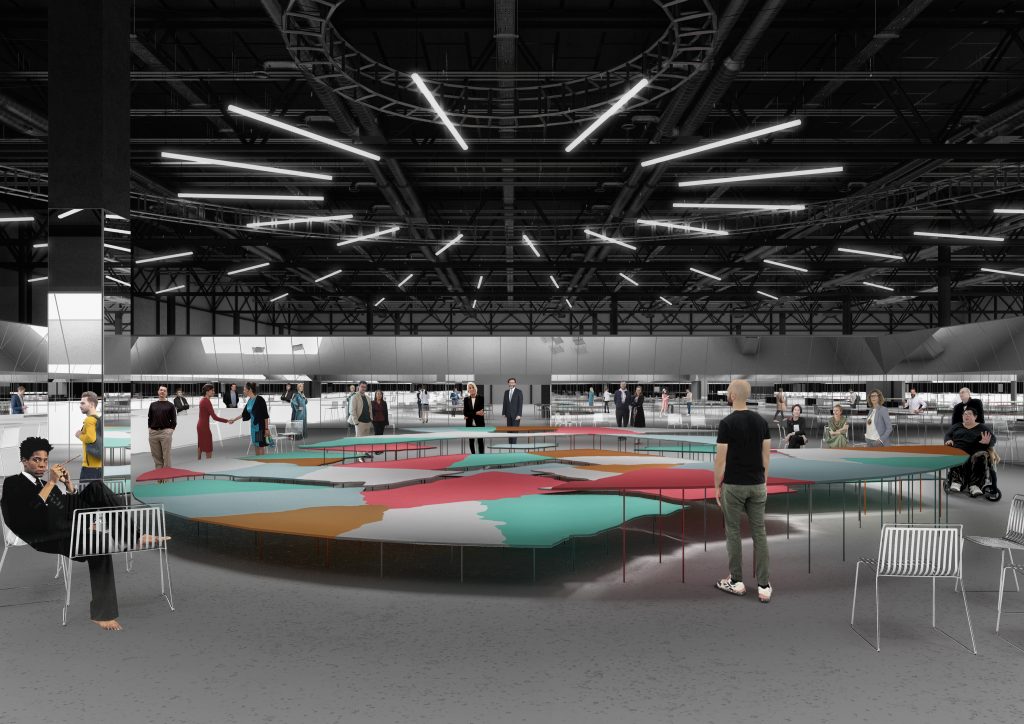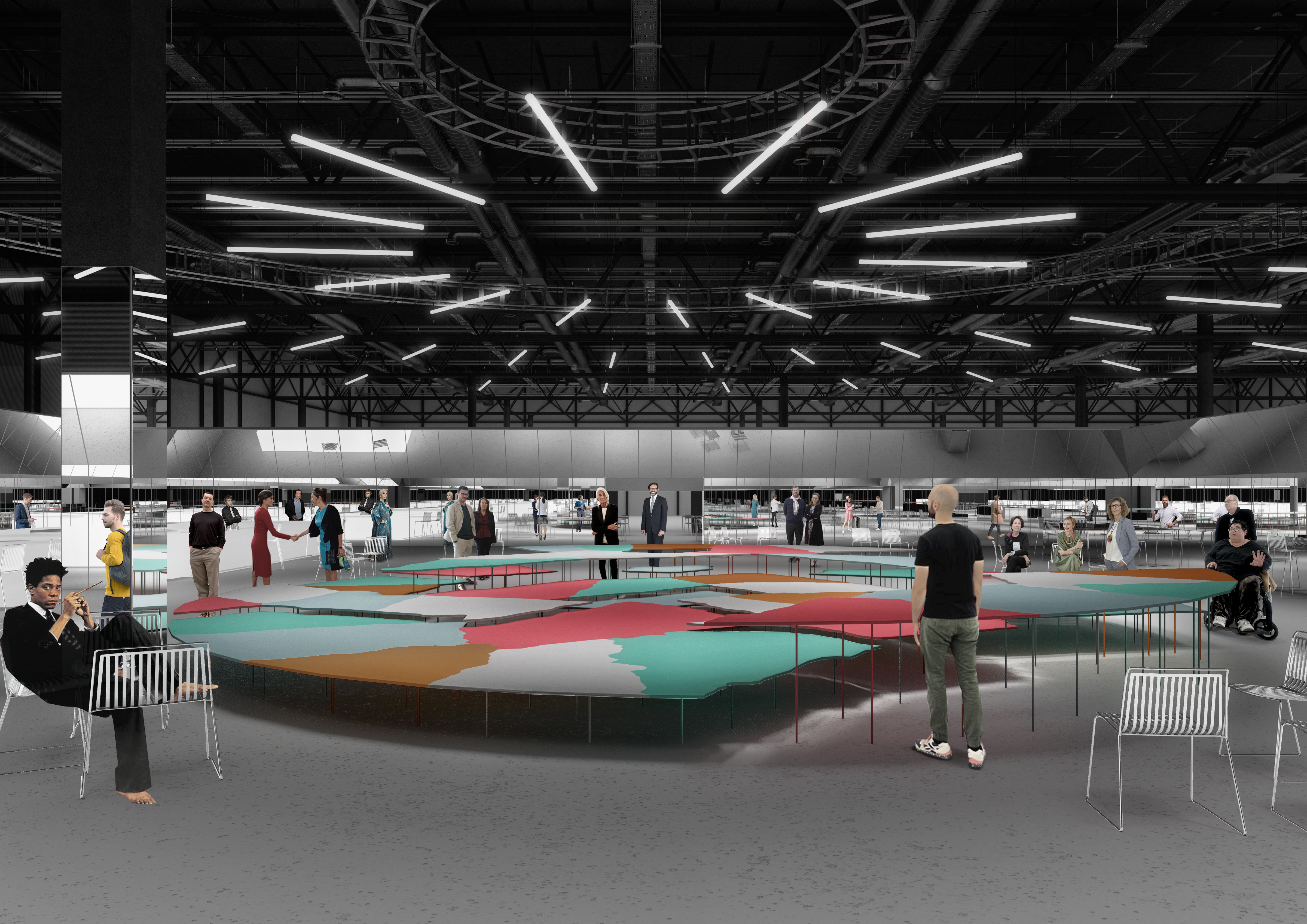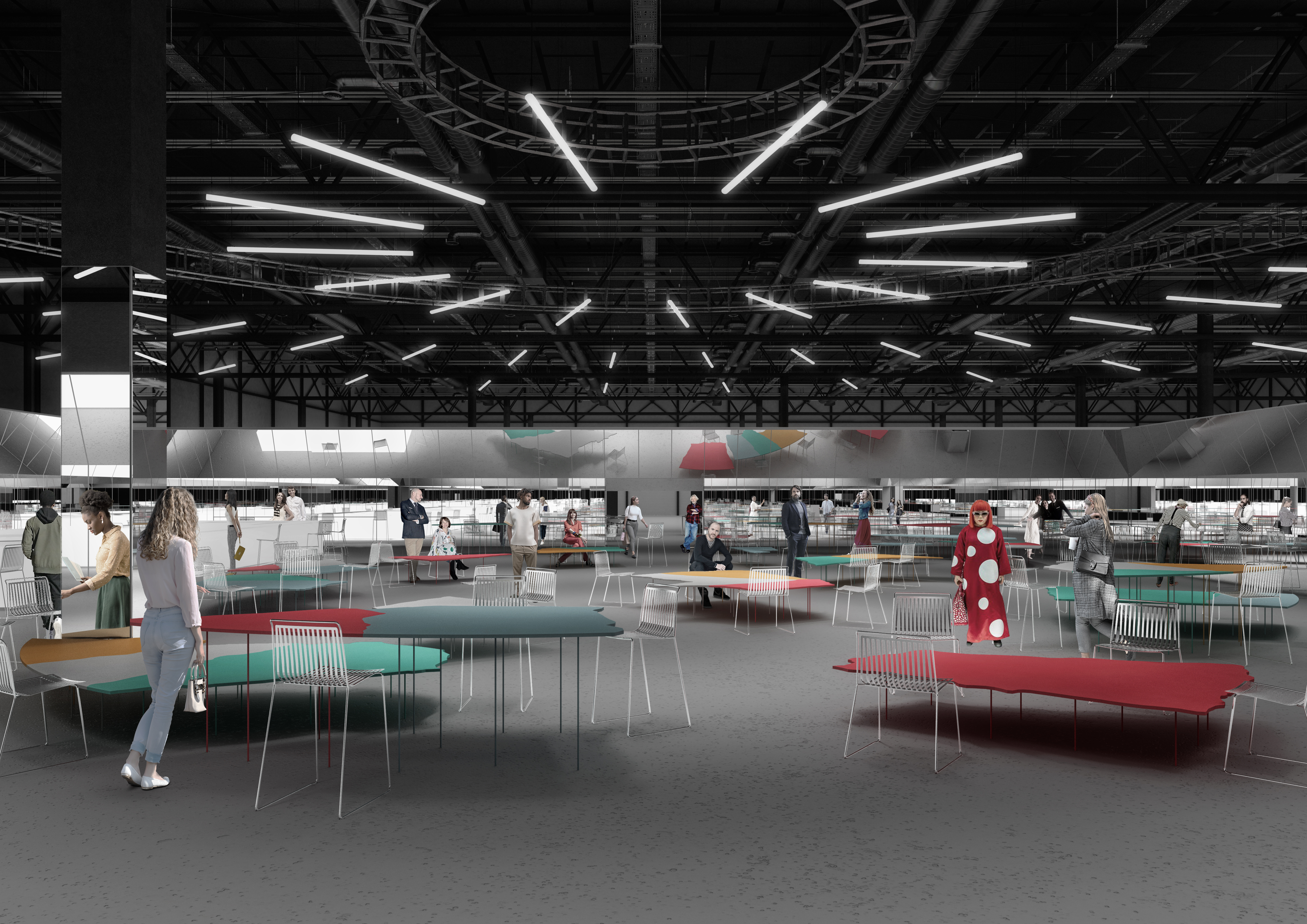 Kaleidoskopio es un contenedor infinito, un espacio de geometrías puras que acoge en su área gravitatoria una gran mesa simbólica en la que todos los visitantes, de una manera especial se podrán sentir identificados en la poesía de sus colores. Esta gran mesa, de 9 metros de diámetro, se compone por 40 unidades que identifican todos y cada uno de los años precedentes de la feria. Se representan así lo individual, con su propio carácter y autenticidad, y lo colectivo, como idea de unión y de respuesta social. La mesa representa un mundo de color, un mundo resiliente que se adapta y evoluciona. Un mundo flexible capaz de reconfigurarse según las necesidades, de ahí que esta gran mesa pueda adquirir múltiples disposiciones en este espacio caleidoscópico