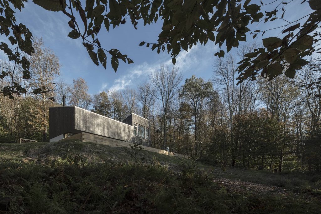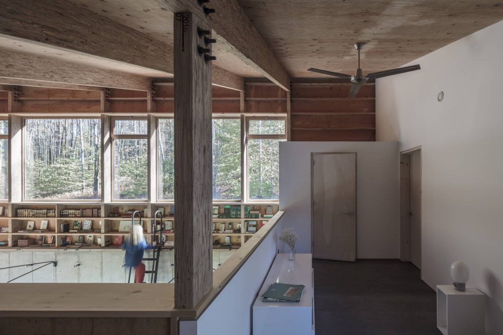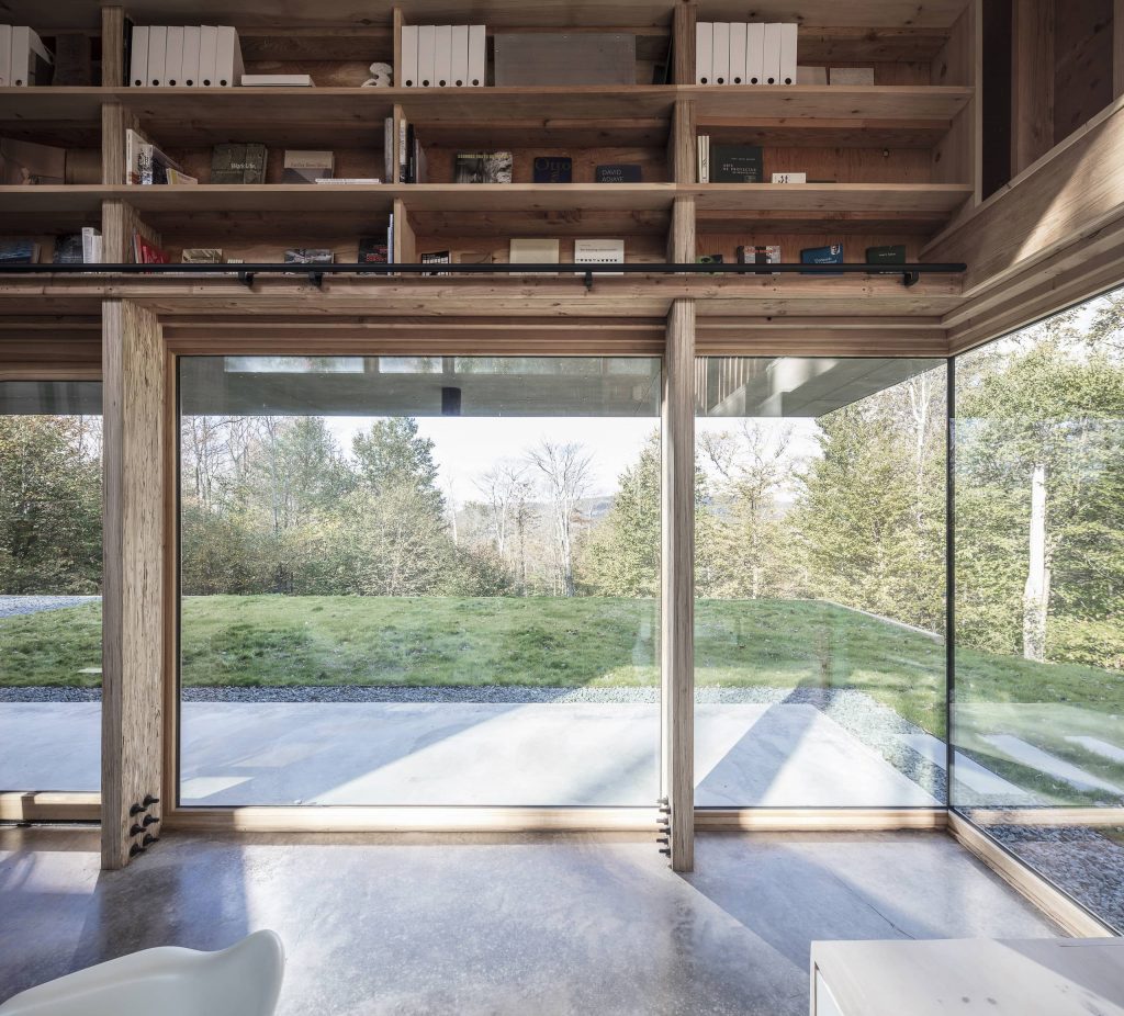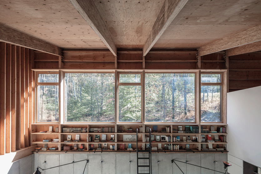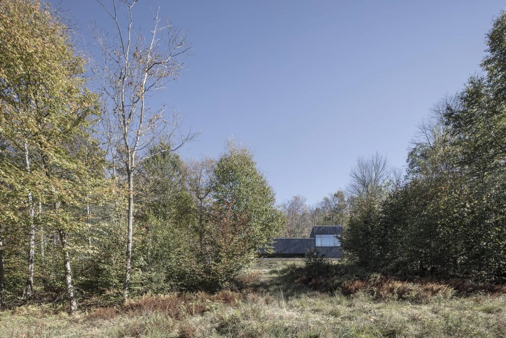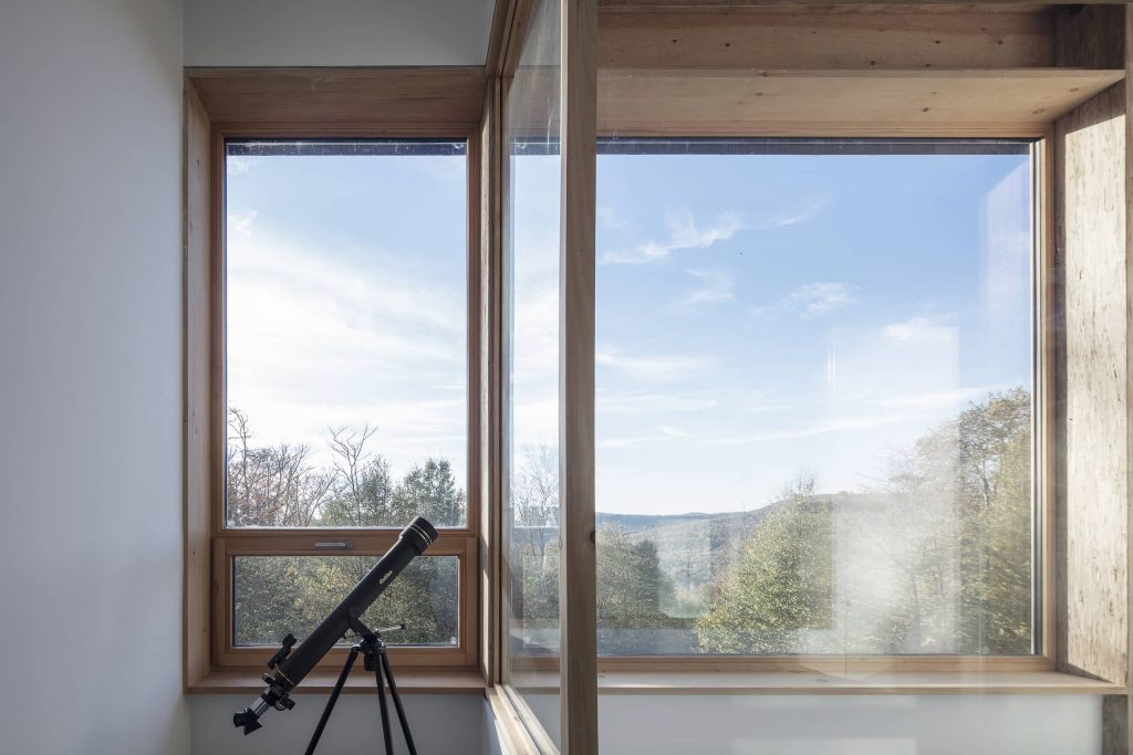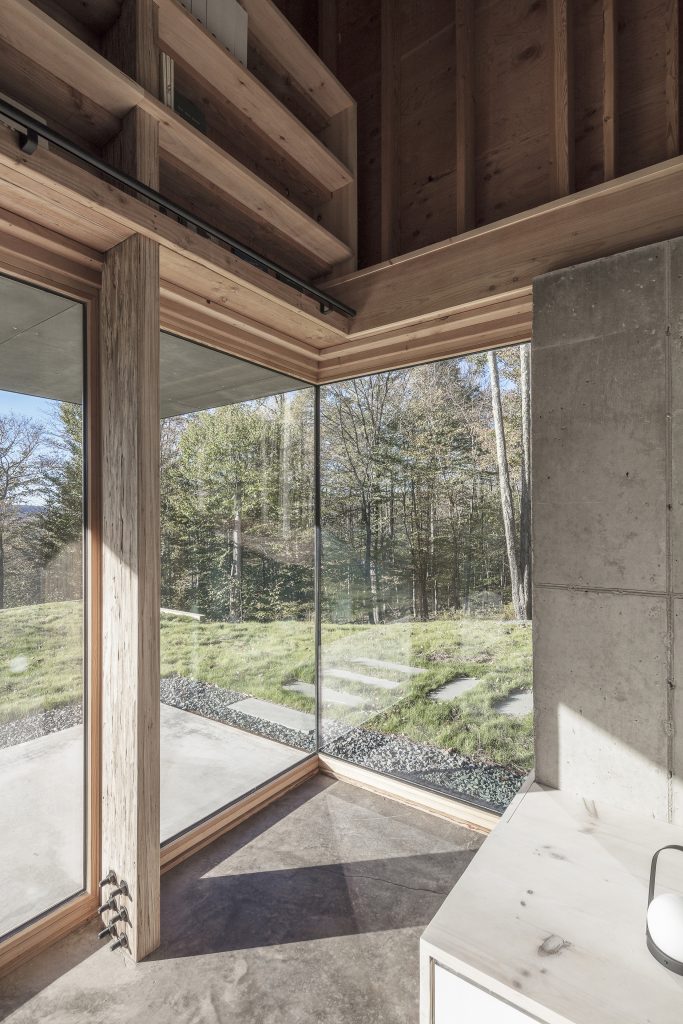 Tres huecos y dos cubiertas inclinadas. El primer gran hueco, además de dar luz indirecta a la escalera y al acceso en la planta inferior abre una vista de pájaro a las montañas desde el dormitorio principal. Los otros dos huecos, flanqueando el espacio de doble altura, muestran dos perspectivas radicalmente distintas: el horizonte lejano montañoso al Oeste y las copas de los árboles al Este. La percepción del espacio interior varía a lo largo del día y a lo largo del año, con el cambio radical del paisaje en cada estación, haciendo que la experiencia de los materiales varíe según la luz, frondosidad y color del bosque.