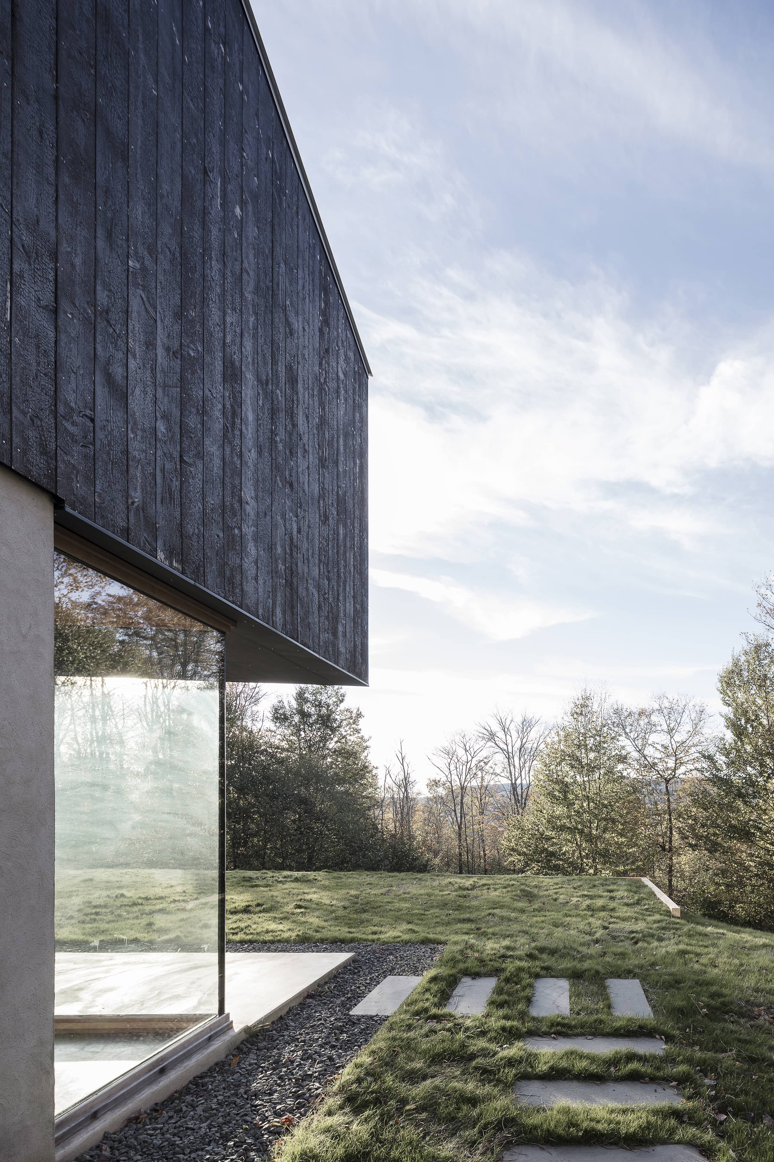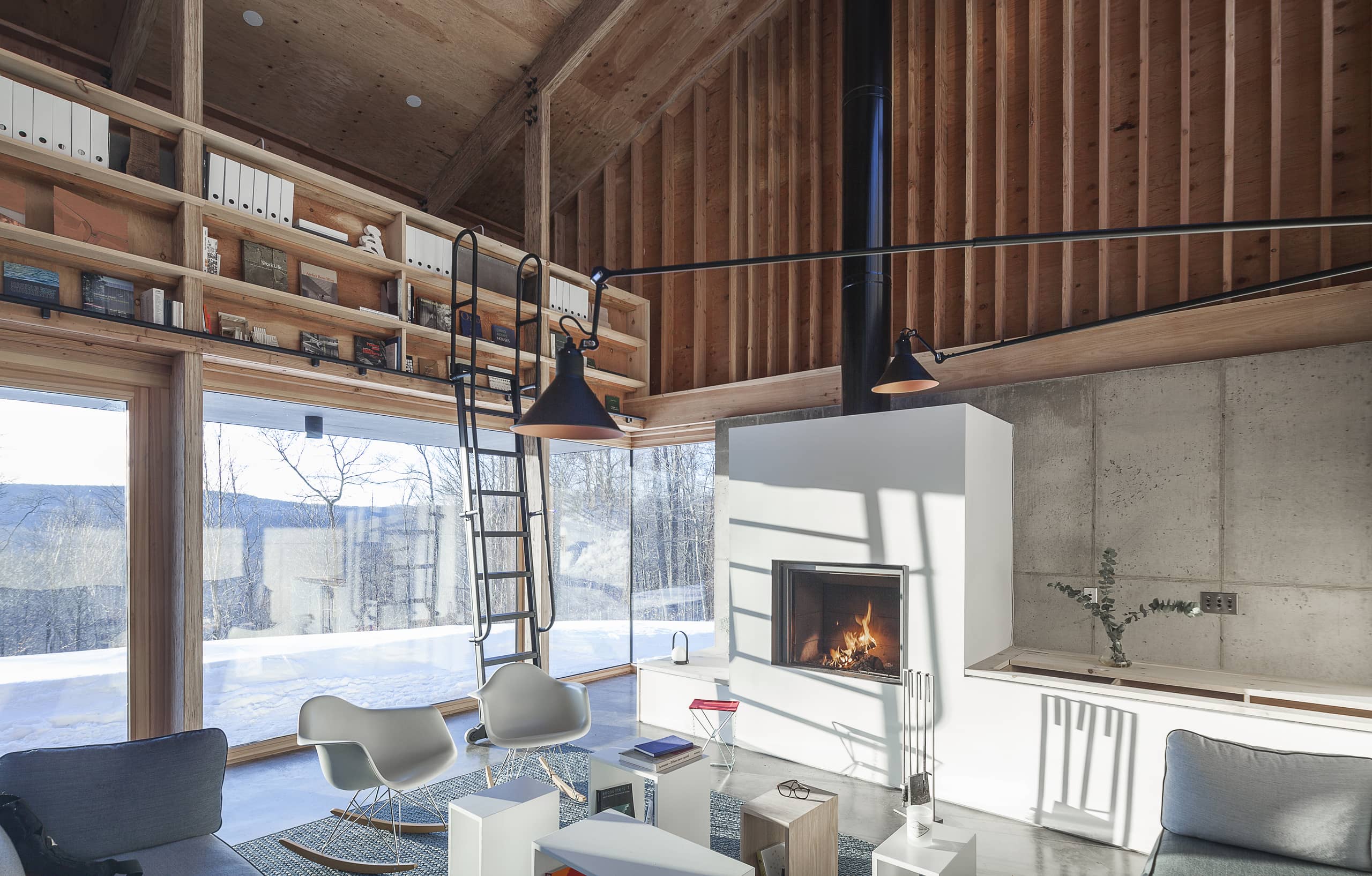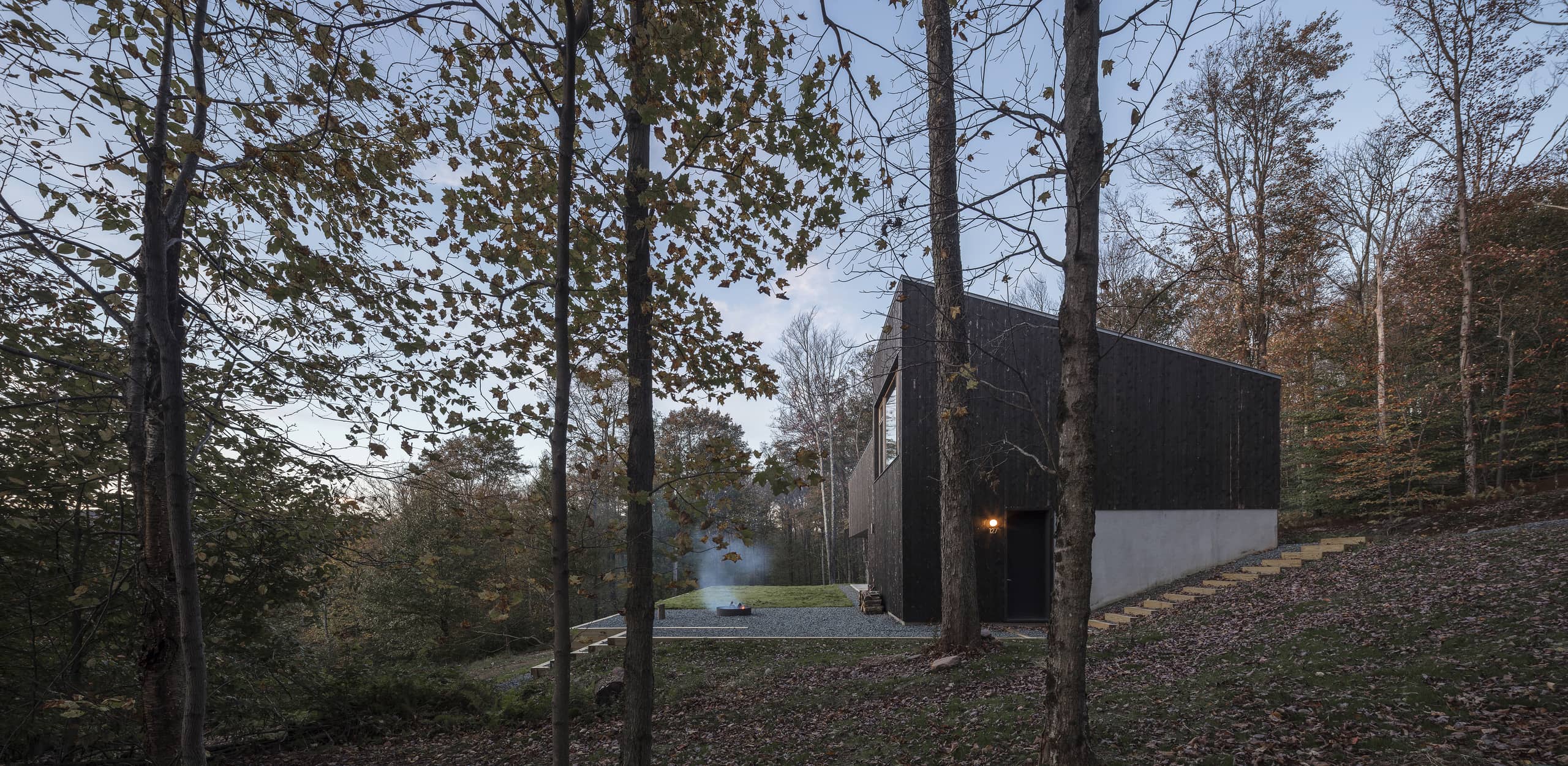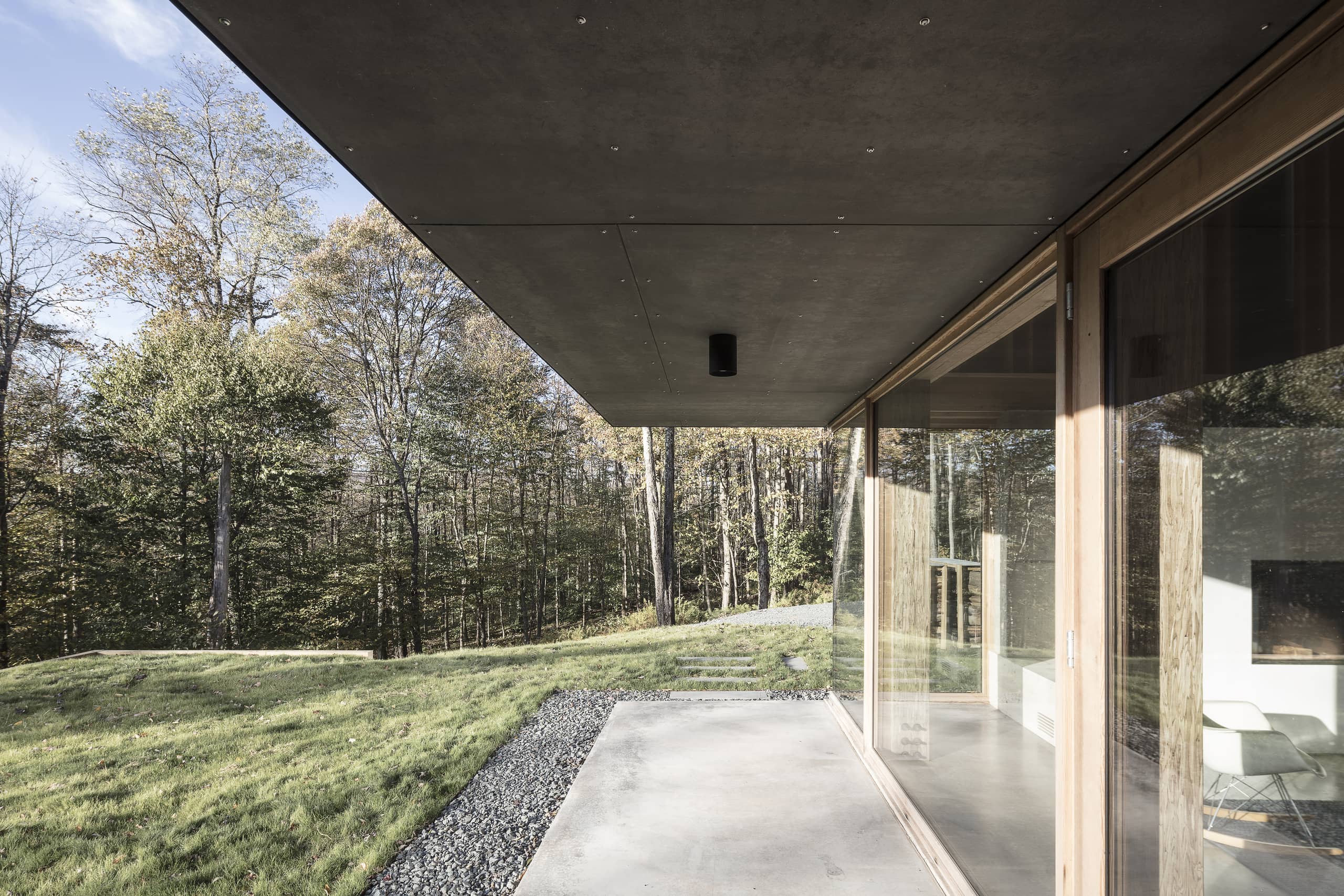 Tres huecos y dos cubiertas inclinadas. El primer gran hueco, además de dar luz indirecta a la escalera y al acceso en la planta inferior abre una vista de pájaro a las montañas desde el dormitorio principal. Los otros dos huecos, flanqueando el espacio de doble altura, muestran dos perspectivas radicalmente distintas: el horizonte lejano montañoso al Oeste y las copas de los árboles al Este. La percepción del espacio interior varía a lo largo del día y a lo largo del año, con el cambio radical del paisaje en cada estación, haciendo que la experiencia de los materiales varíe según la luz, frondosidad y color del bosque.