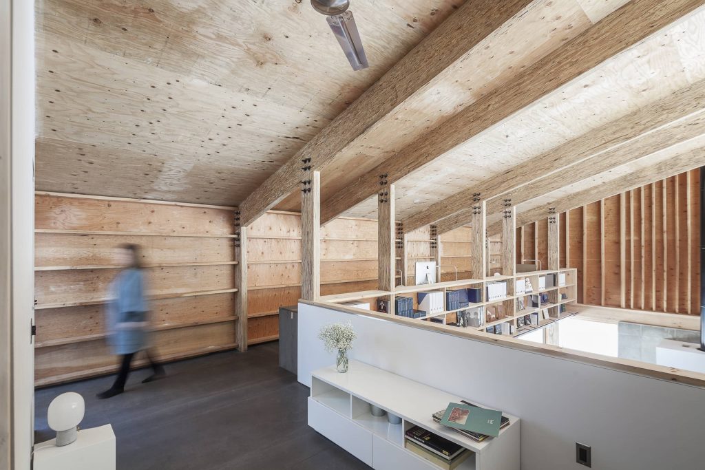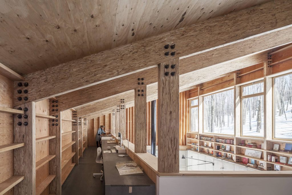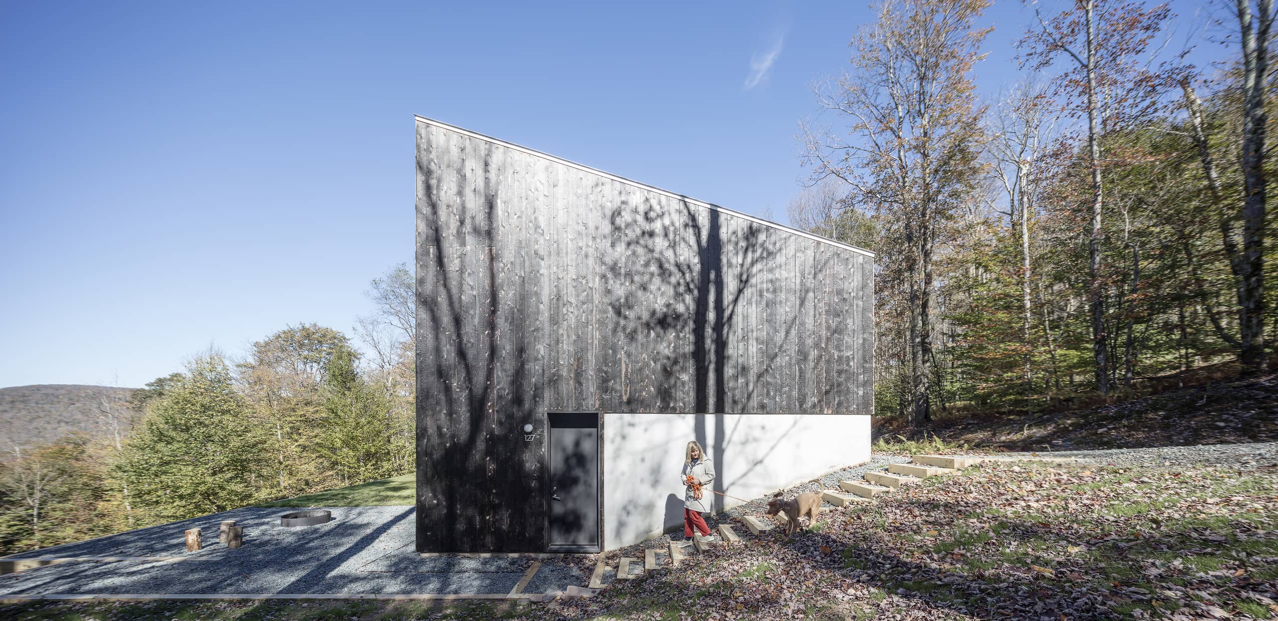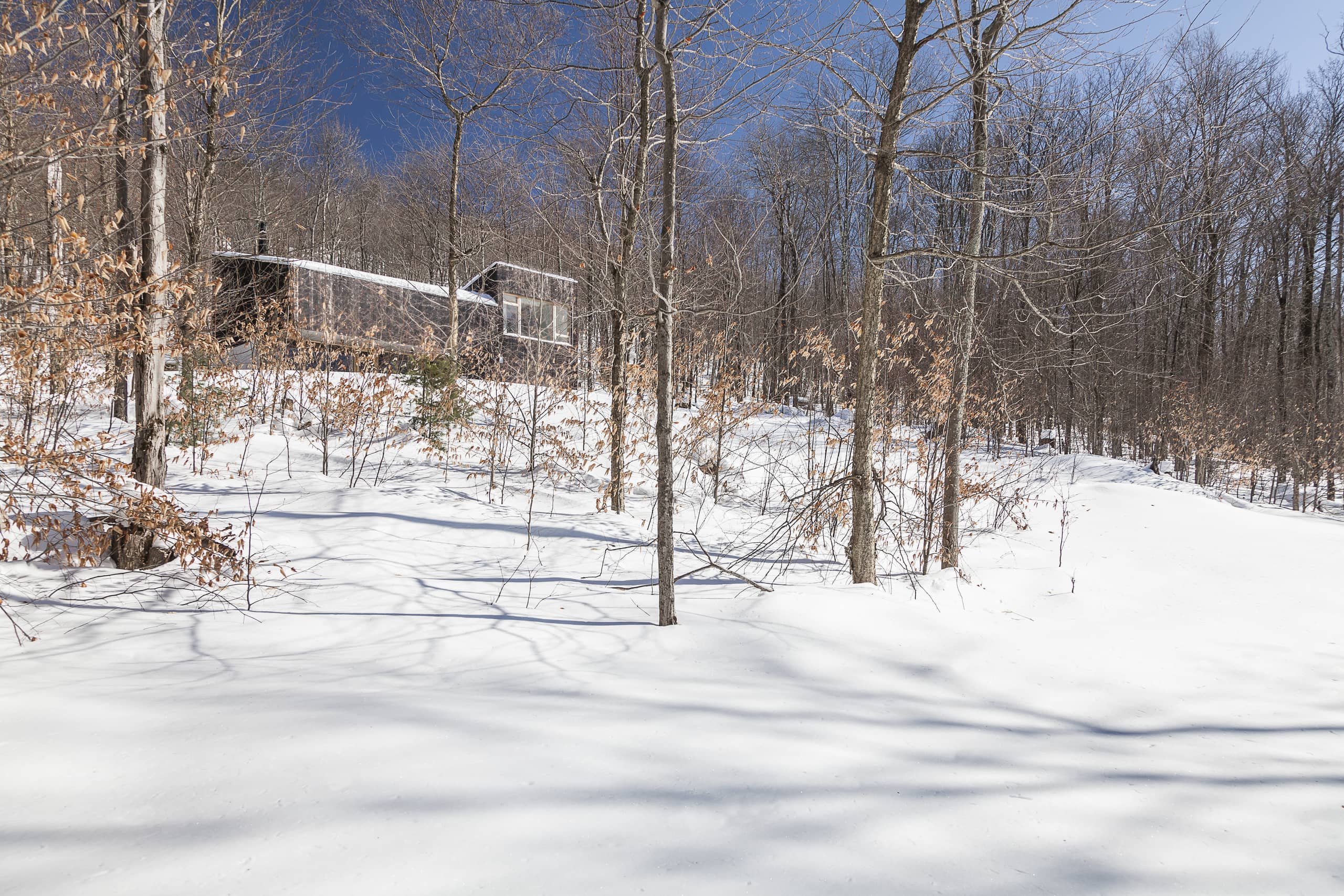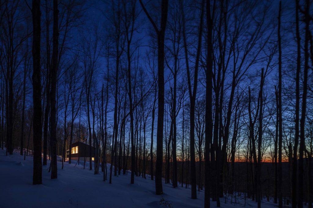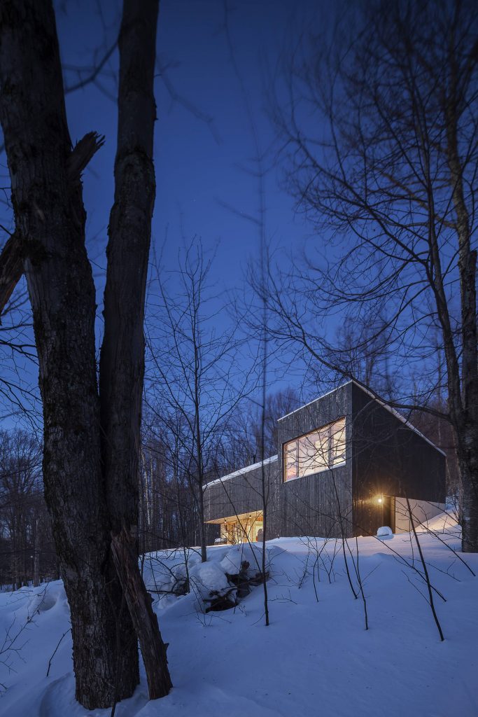 Tres huecos y dos cubiertas inclinadas. El primer gran hueco, además de dar luz indirecta a la escalera y al acceso en la planta inferior abre una vista de pájaro a las montañas desde el dormitorio principal. Los otros dos huecos, flanqueando el espacio de doble altura, muestran dos perspectivas radicalmente distintas: el horizonte lejano montañoso al Oeste y las copas de los árboles al Este. La percepción del espacio interior varía a lo largo del día y a lo largo del año, con el cambio radical del paisaje en cada estación, haciendo que la experiencia de los materiales varíe según la luz, frondosidad y color del bosque.