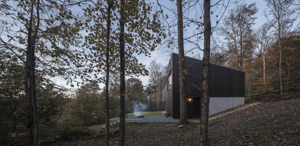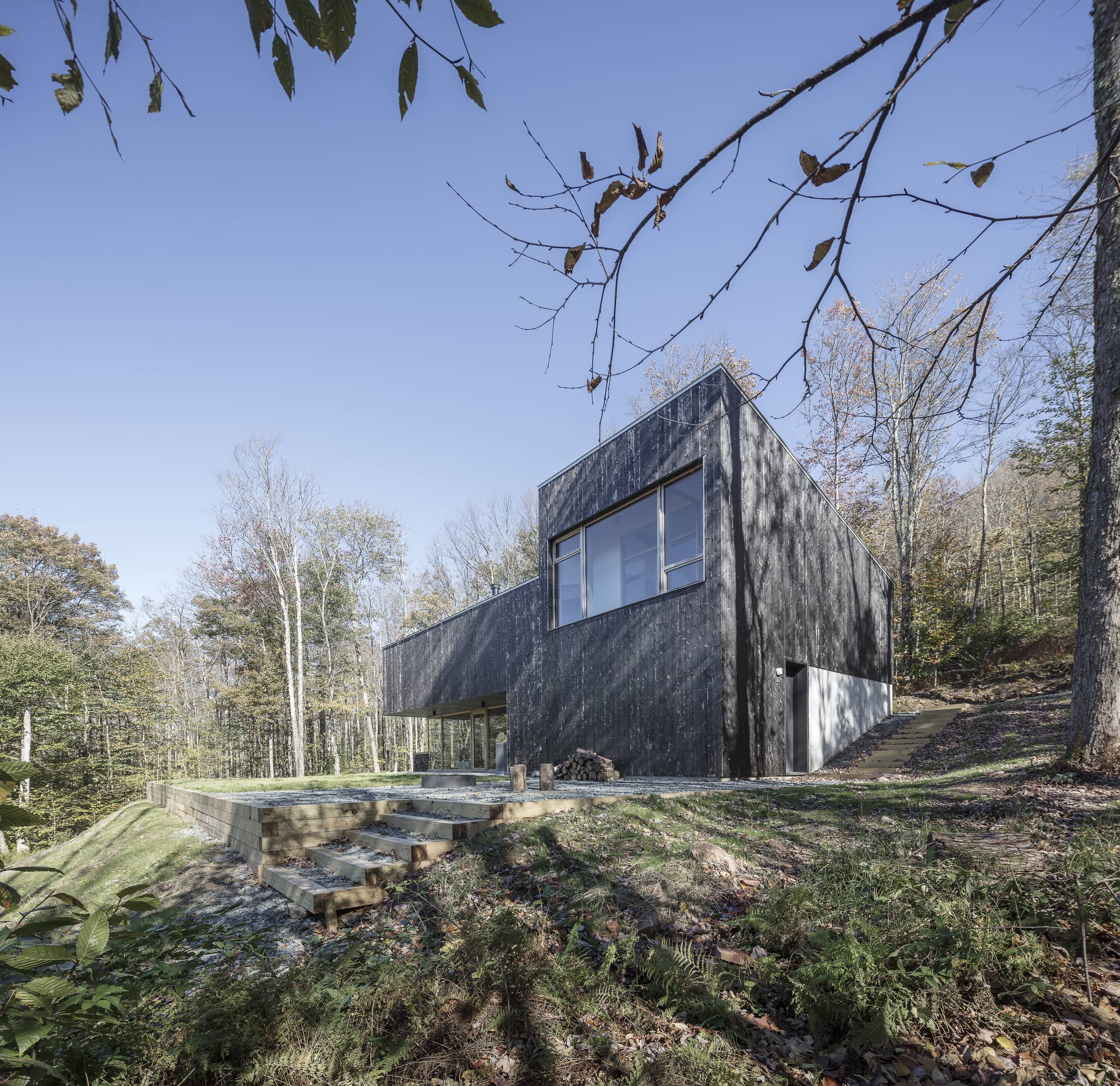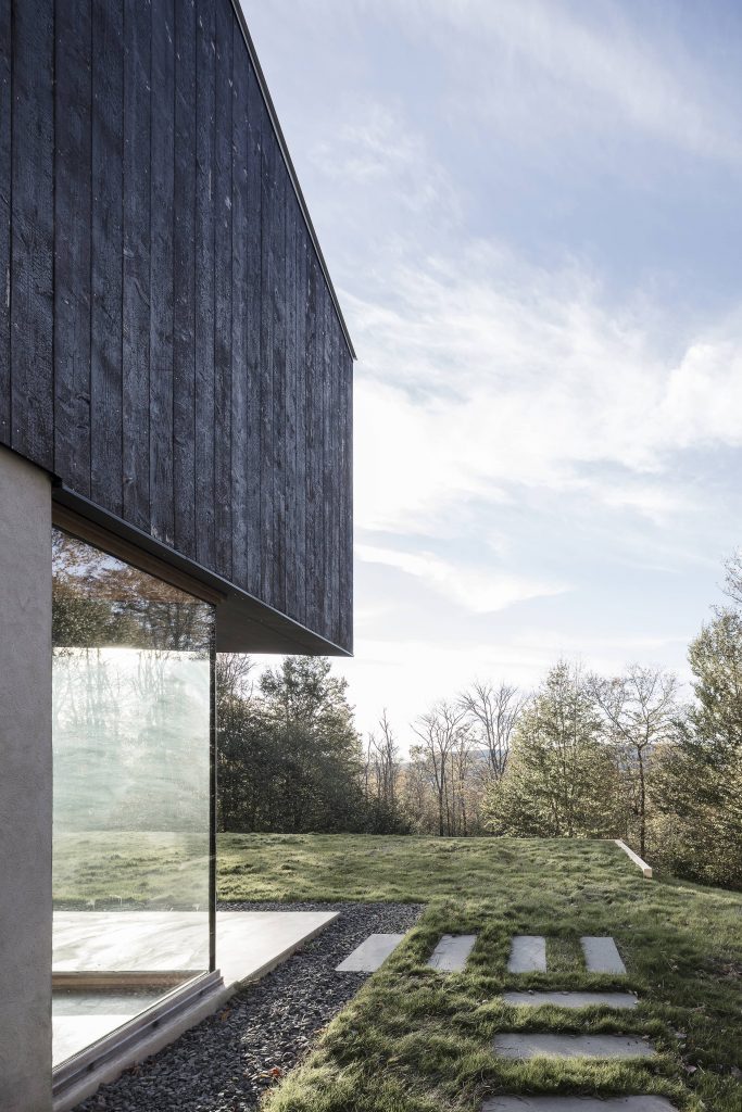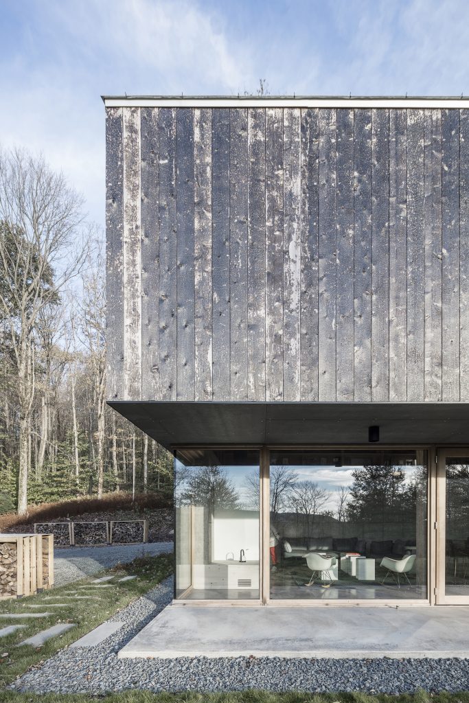 Se construye un sistema de fachada ventilada con todo el aislamiento en la cara exterior del muro y cubierta, consiguiendo una envolvente continua, eliminando puentes térmicos y dejando la estructura vista hacia el interior de la casa. En fachada, se utiliza cedro carbonizado “Shou Sugi Ban”, una técnica japonesa que da a la madera mayor resistencia al agua, al fuego y a los insectos sin ningún tipo de mantenimiento. El proceso de carbonizado proporciona una textura iridiscente que refleja la luz y los colores de las distintas estaciones y horas del día. Además, el envejecimiento del cedro carbonizado con el paso del tiempo y de los elementos entra en sintonía con el bosque.