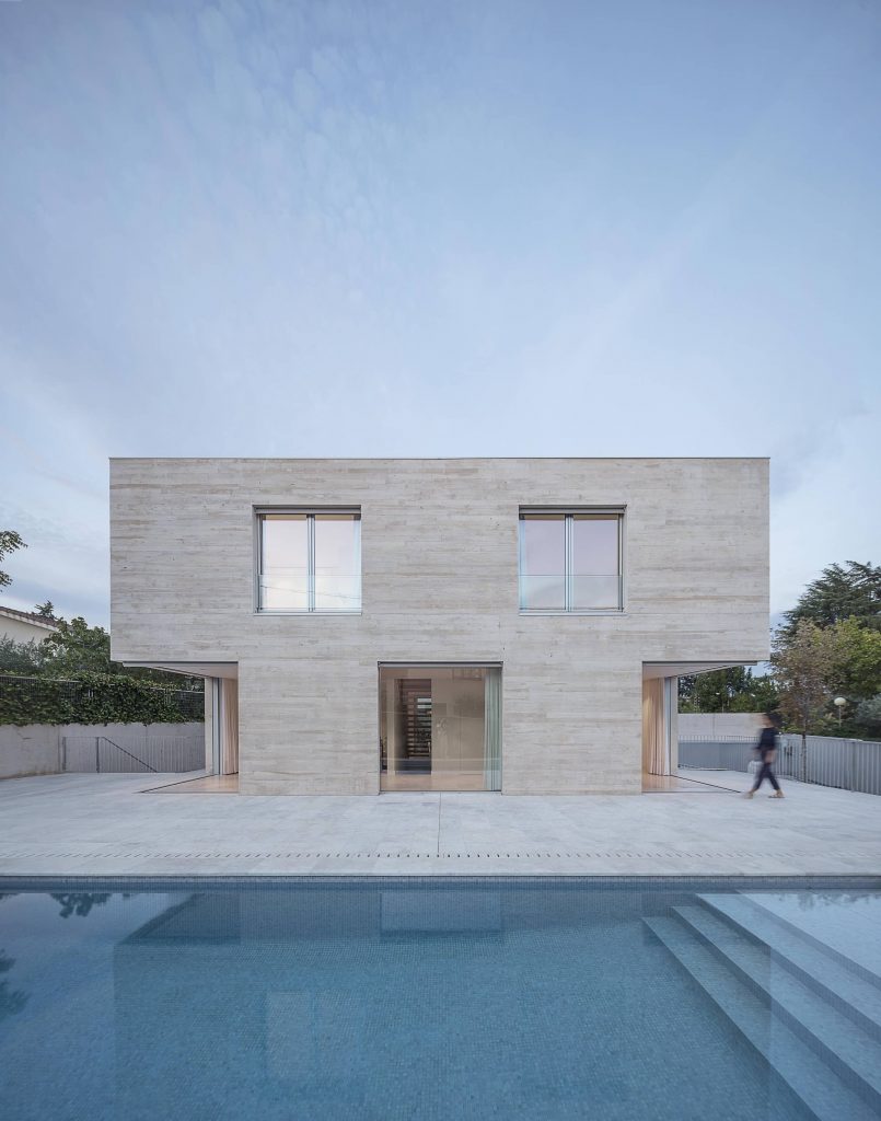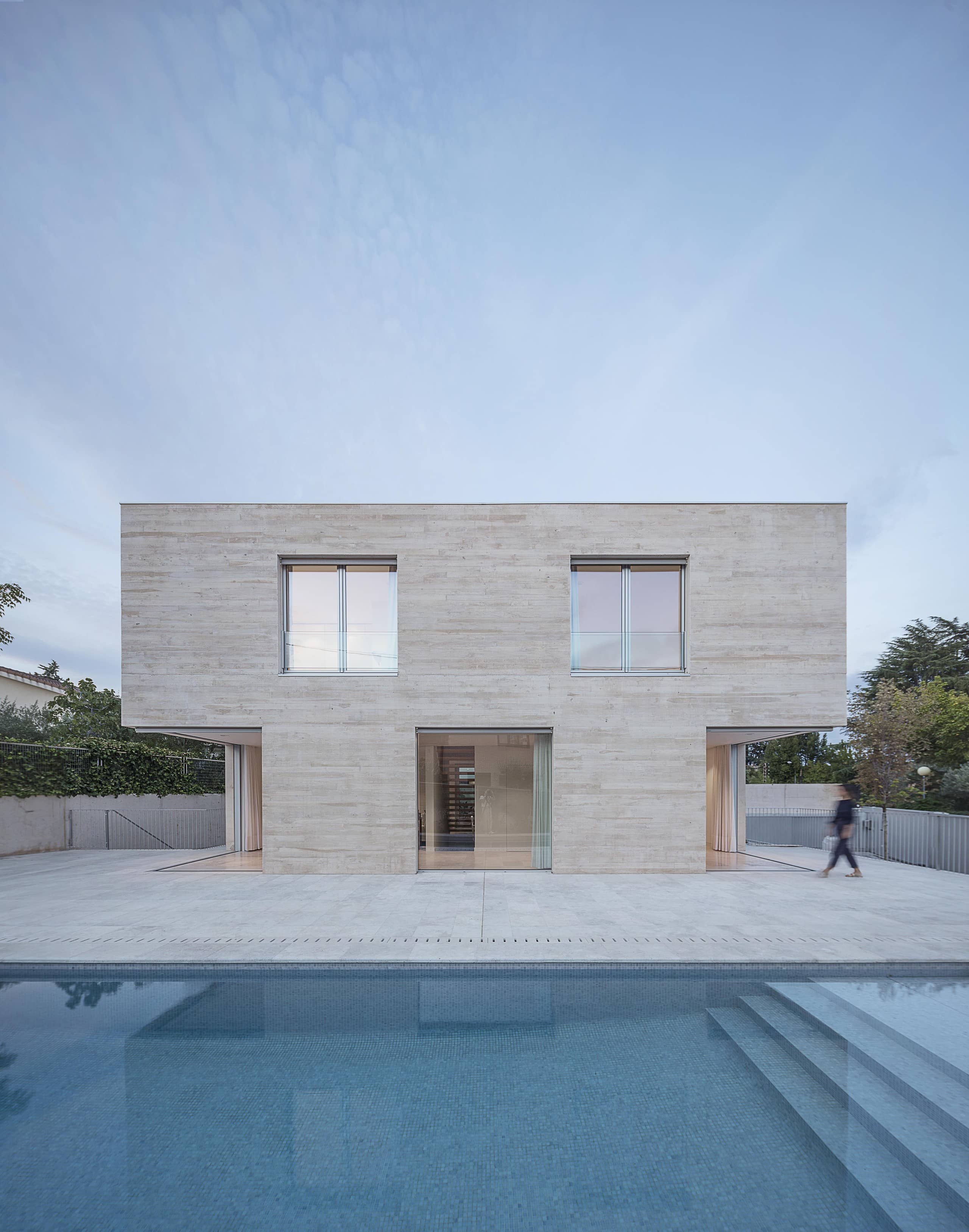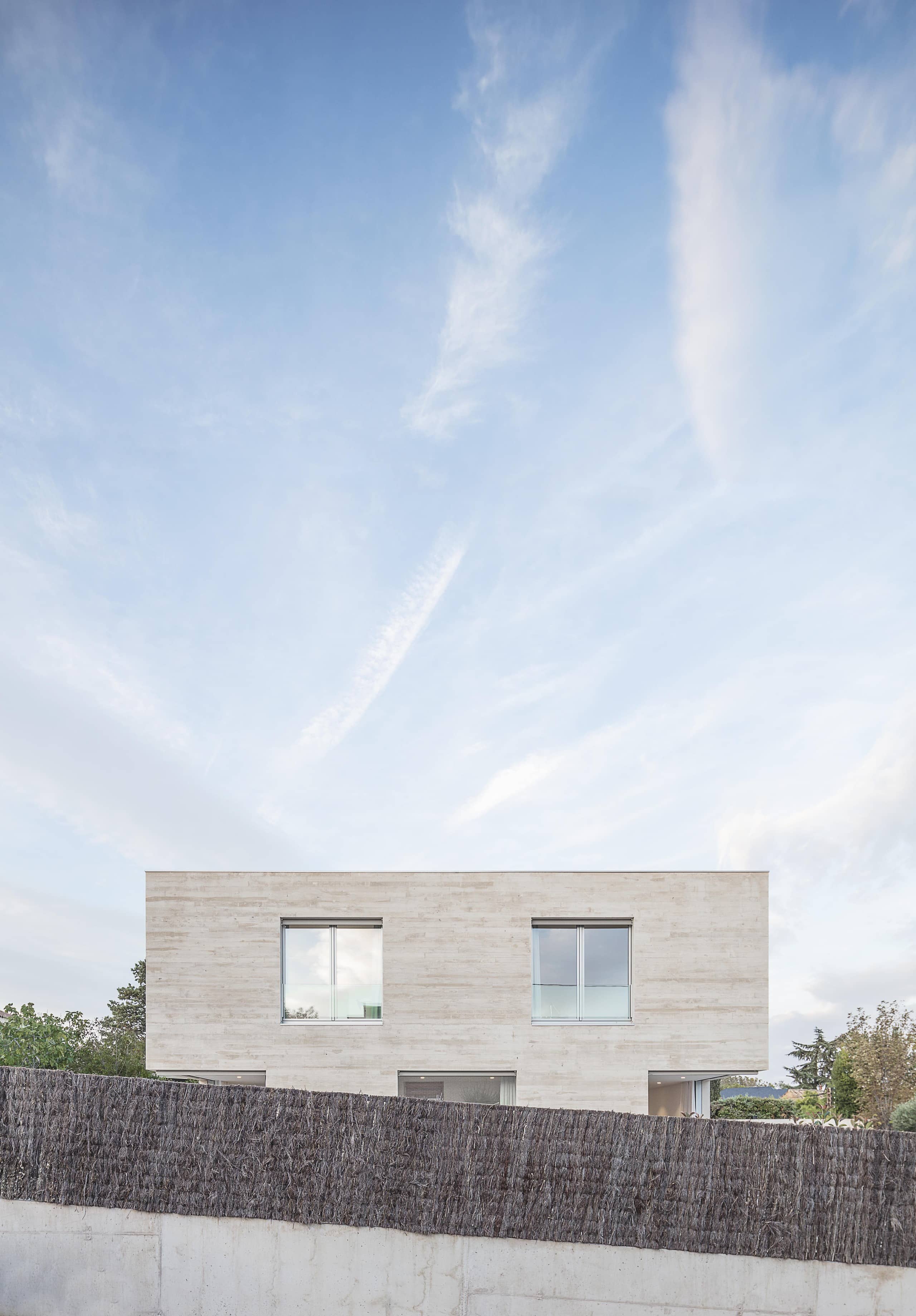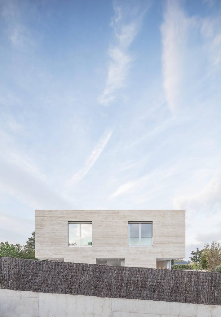 La construcción de la estructura se realiza en hormigón blanco con encofrado de tablilla de madera, posibilitando los cuatro grandes voladizos de las cuatro esquinas en planta baja. El interior y exterior se diluyen gracias a un pavimento continuo de piedra caliza de Campaspero que extiende las cuatro esquinas abiertas de la vivienda hacia las diagonales de la parcela, generando así una mayor amplitud visual. Un núcleo central alberga la escalera, el ascensor y las instalaciones que recorren las tres plantas de la vivienda.
