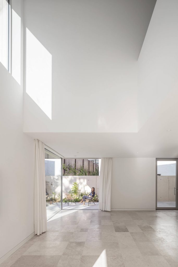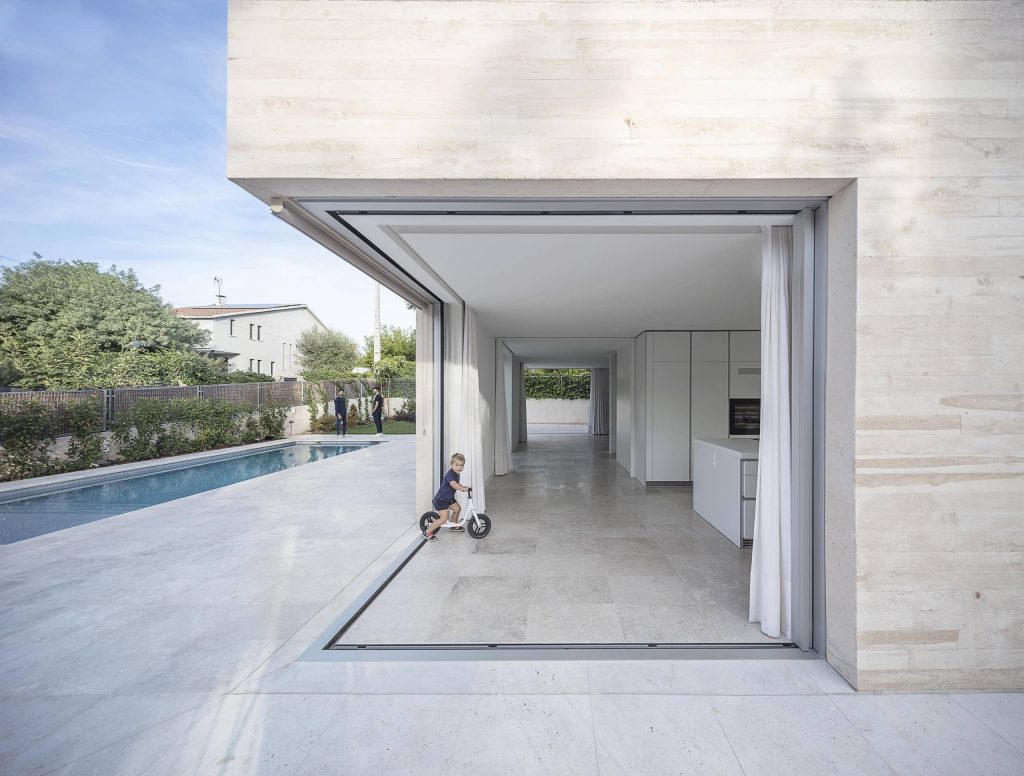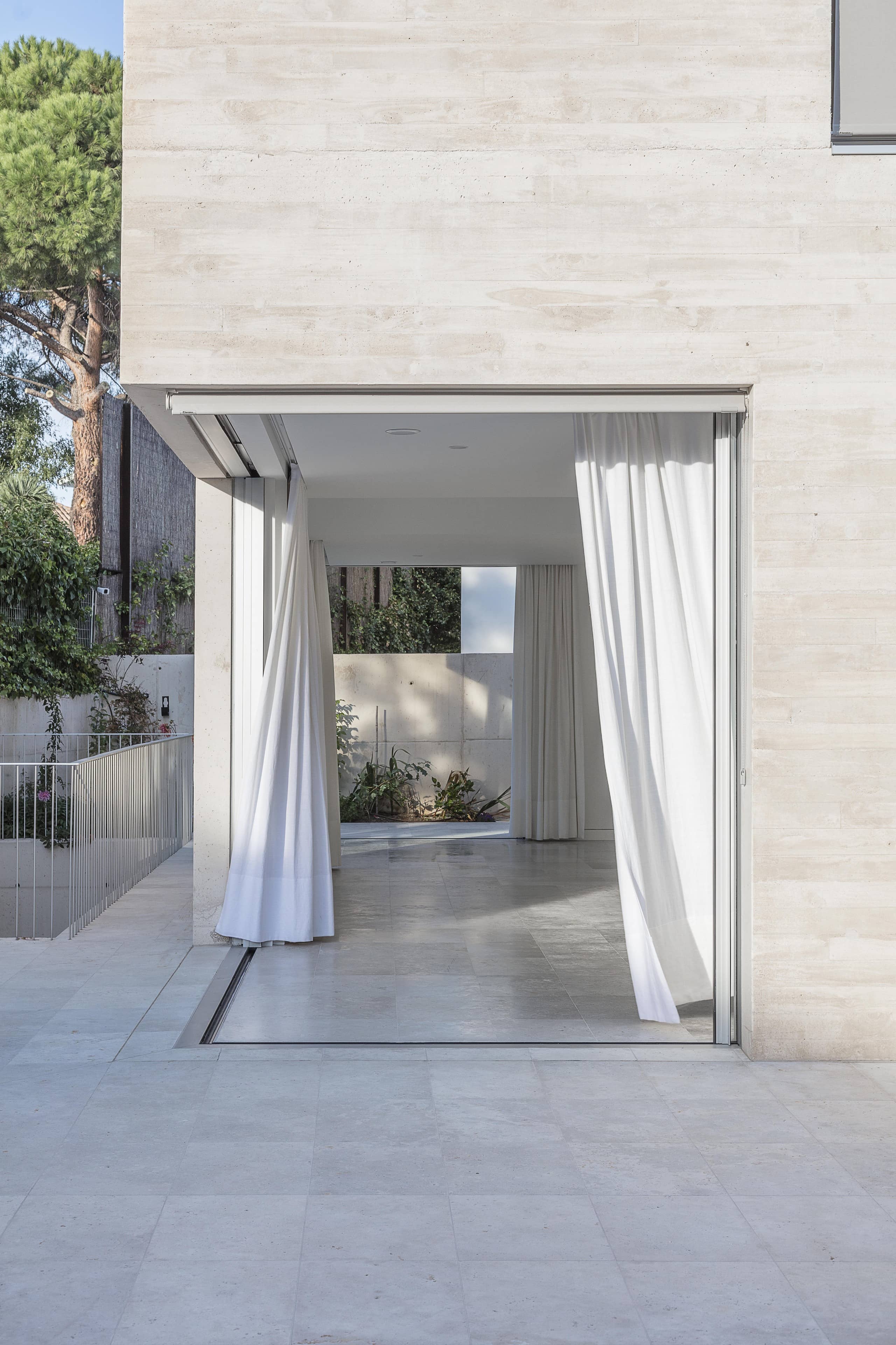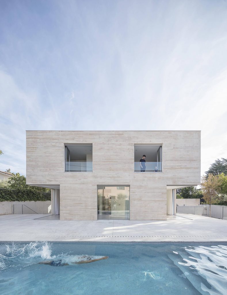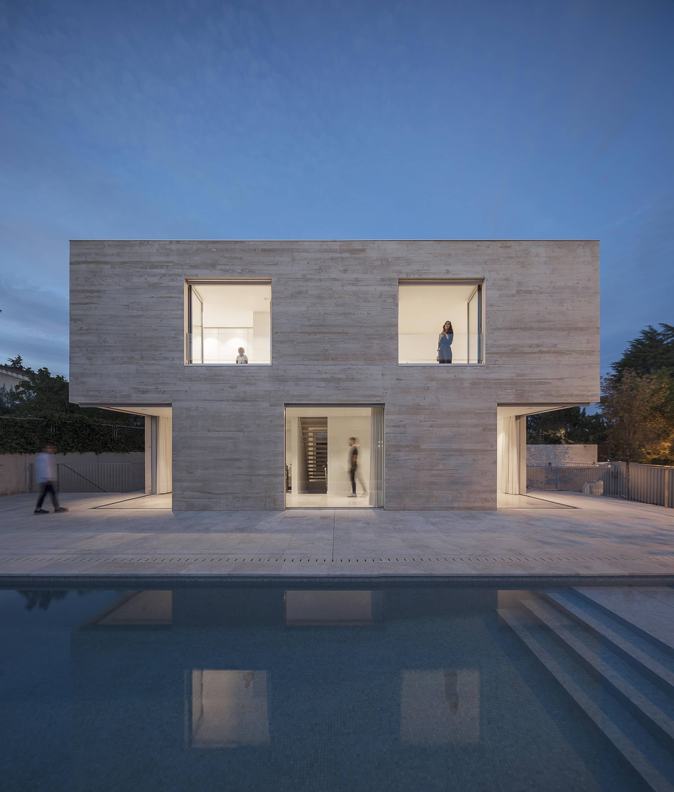 La construcción de la estructura se realiza en hormigón blanco con encofrado de tablilla de madera, posibilitando los cuatro grandes voladizos de las cuatro esquinas en planta baja. El interior y exterior se diluyen gracias a un pavimento continuo de piedra caliza de Campaspero que extiende las cuatro esquinas abiertas de la vivienda hacia las diagonales de la parcela, generando así una mayor amplitud visual. Un núcleo central alberga la escalera, el ascensor y las instalaciones que recorren las tres plantas de la vivienda.