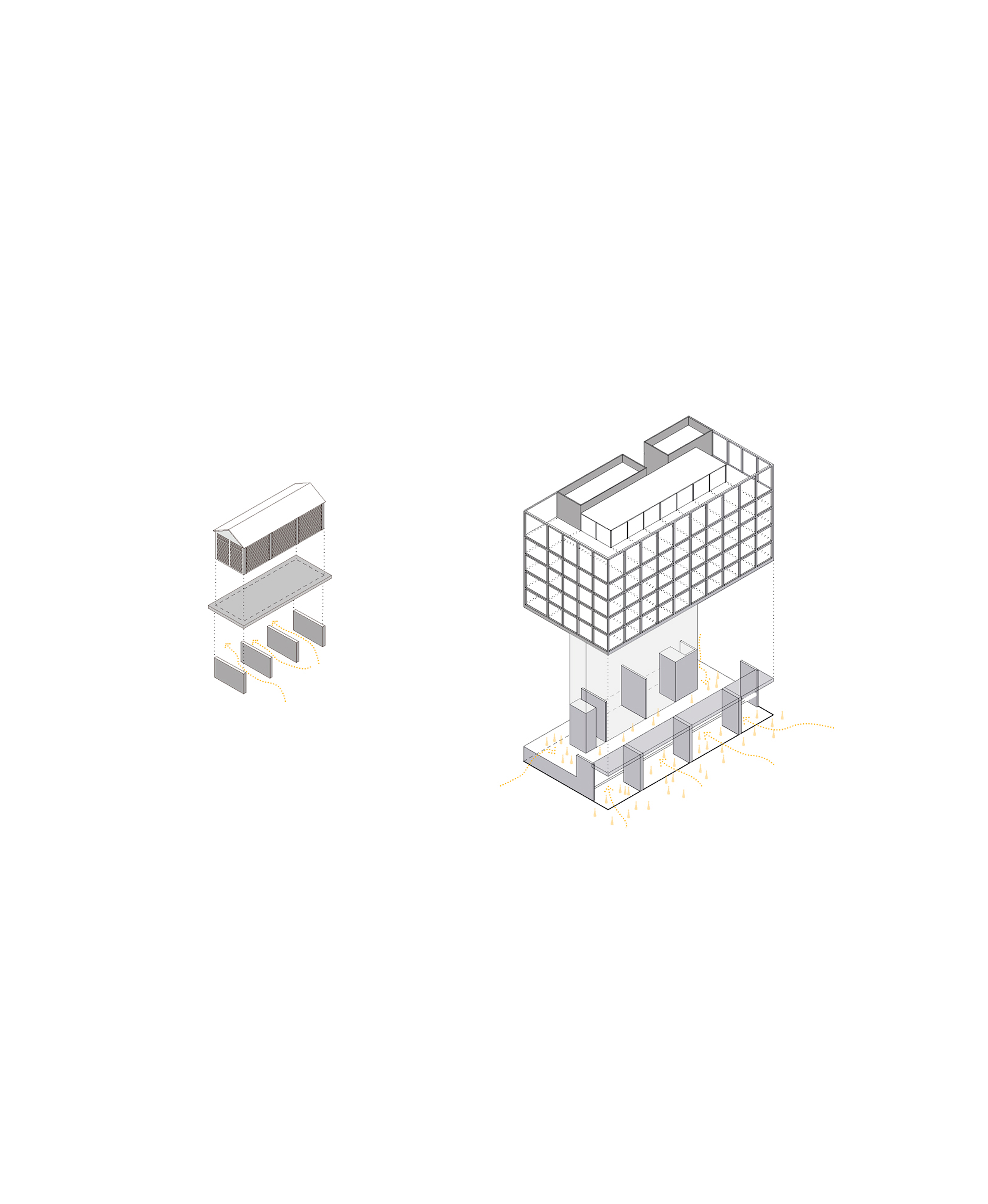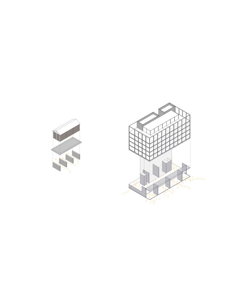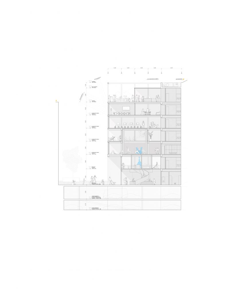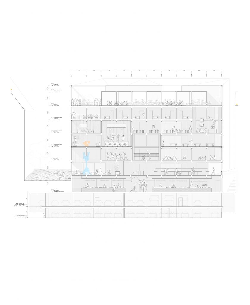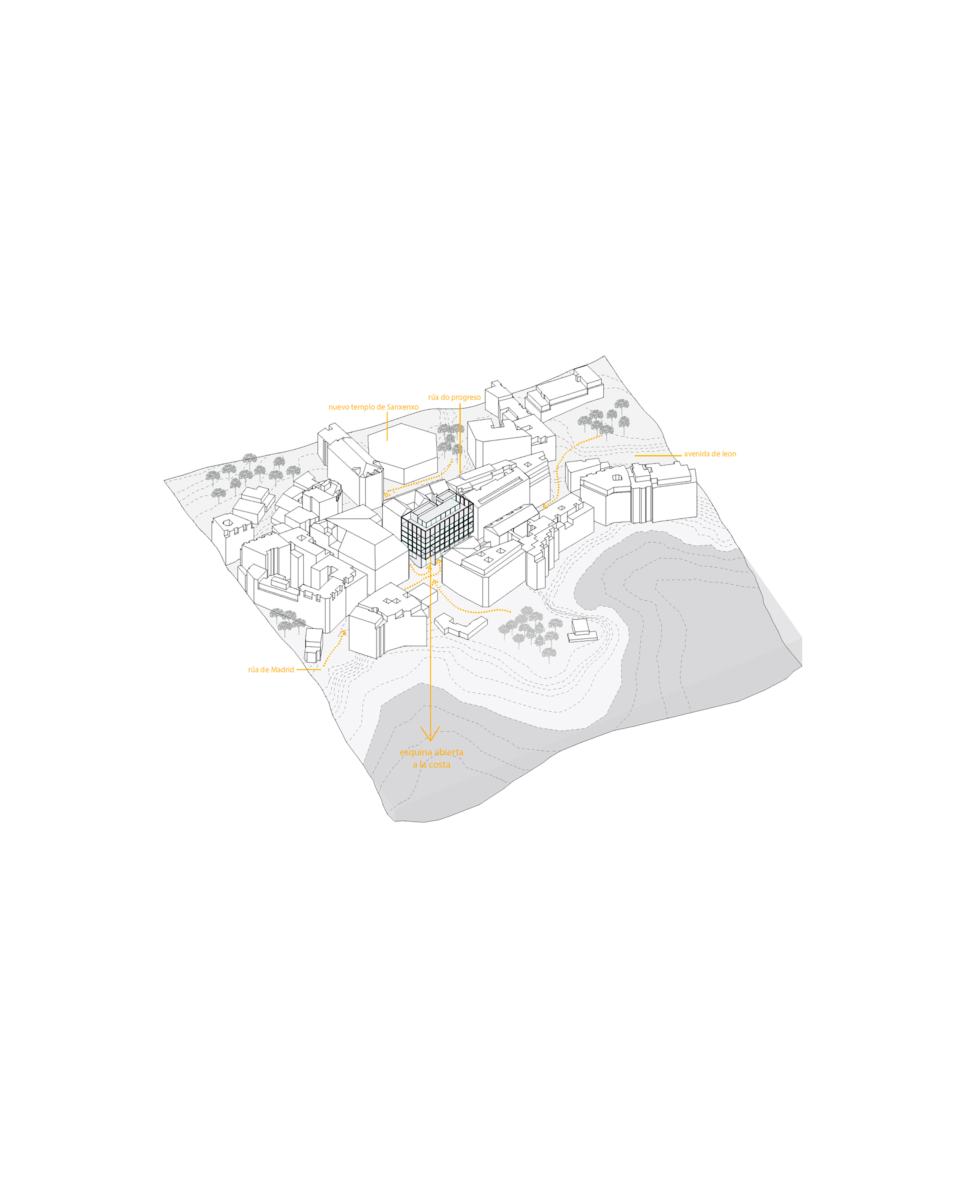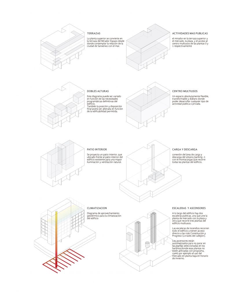 Se proyecta ESPAZO. Planteamos una arquitectura desnuda, de esqueleto y piel, un espacio flexible que permita una distribución, e incluso una transformación en el tiempo, acorde a las necesidades cambiantes de nuestra sociedad actual. Una idea poética que nos ilusiona imaginar como un gran hórreo, un espacio de nuestro tiempo donde se unirán por un lado la actividad existente del mercado de abastos, revisado en clave contemporánea con la inclusión de un espacio gourmet, y por otro lado actividades complementarias para la comunidad.