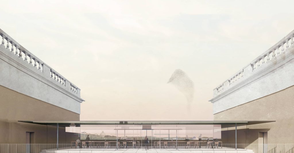 La propuesta arquitectónica presentada bajo el lema Futuro Precedente, haciendo referencia a un futuro enraizado en el conocimiento de la historia, pretende resolver los diversos problemas que presenta el edificio en relación con su adecuación a la normativa edificatoria italiana, actuando y restaurando aquellos elementos esenciales de su estructura original y en su complejo diagrama de circulaciones, restableciendo incluso algunas conexiones del convento original para enlazar mejor los dos claustros y, a su vez, el claustro del Tempietto con el jardín. La propuesta ofrece además una ampliación, que ayuda a resolver la actual carencia de espacios específicos destinados al buen desarrollo de los procesos creativos y de investigación de los residentes.
